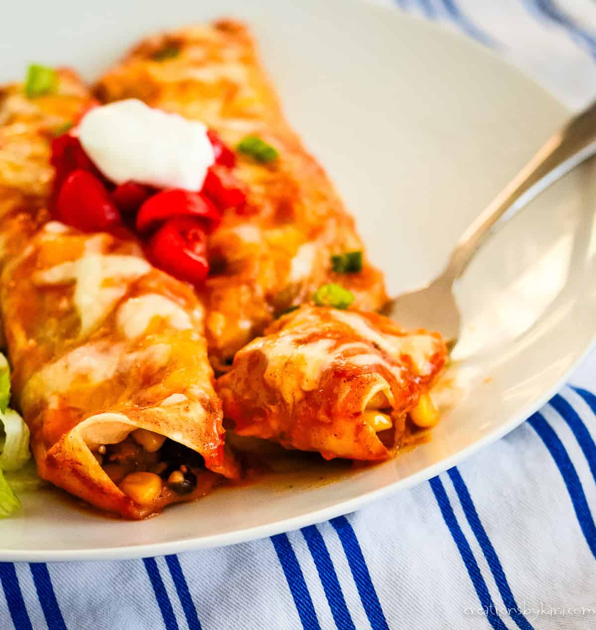 My family instantly fell in love with this black bean enchilada recipe! They are simply delicious, plenty cheesy, and we didn’t even miss the meat. A perfect dinner for busy weeknights when you forgot to defrost meat! I’ve never been much of a fan of enchiladas with red sauce; I almost always prefer green enchilada…