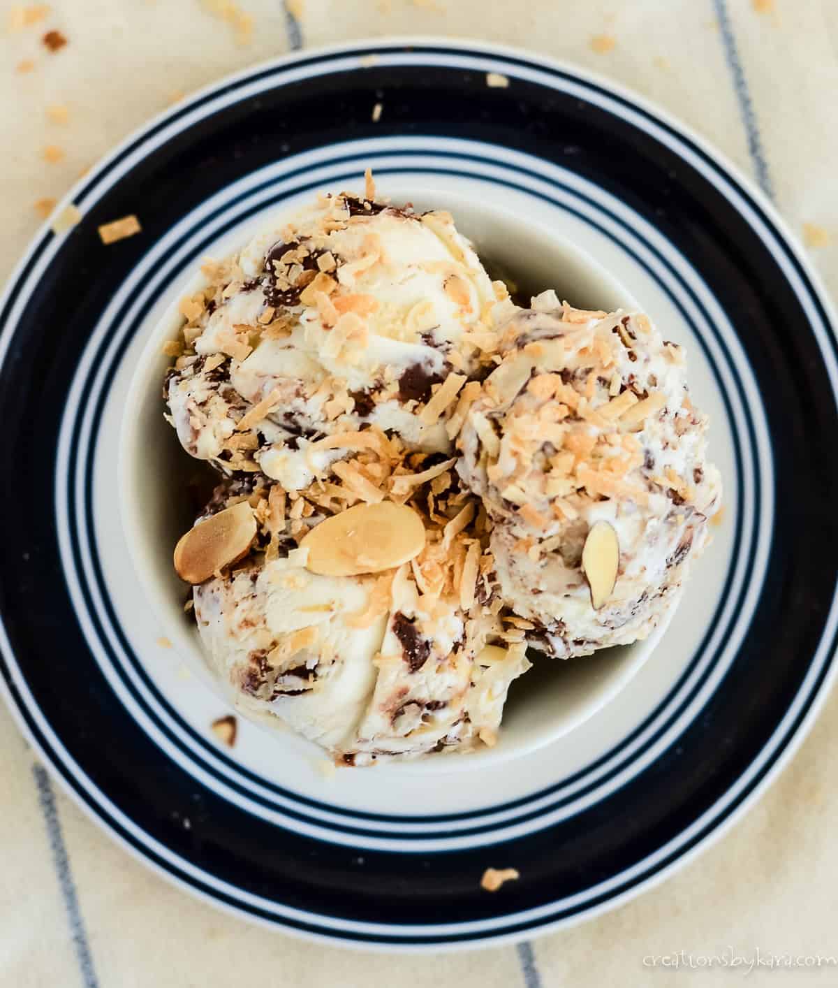 - Layer about a third of the churned ice cream, toasted coconut, toasted almonds, and chocolate ripple in a freezer-safe container. Repeat 2 times. Swirl gently with the handle of a spoon.
