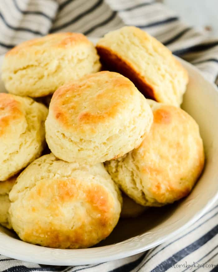 Because they have a bit of yeast in addition to baking powder and baking soda, these biscuits are a cross between a homemade roll and a buttermilk biscuit. Every bite is heavenly!