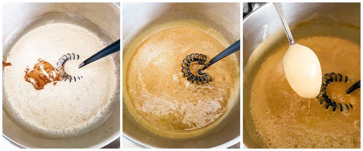 - COOK – Whisk together about 1/4 cup of the heavy whipping cream, brown sugar, cinnamon, salt, and eggs in a heavy saucepan until very smooth. Stir in the remaining cream and the cookie butter. Cook and stir over medium-low heat until thickened. The temperature should be 165 degrees.