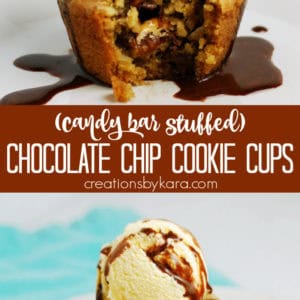 Chocolate chip cookies are pretty much a staple dessert, right? They are easy to make, and everyone loves them. But take some basic chocolate chip cookie dough, bake it in a muffin cup, and fill it with a mini candy bar, and now you have an over the top awesome dessert!