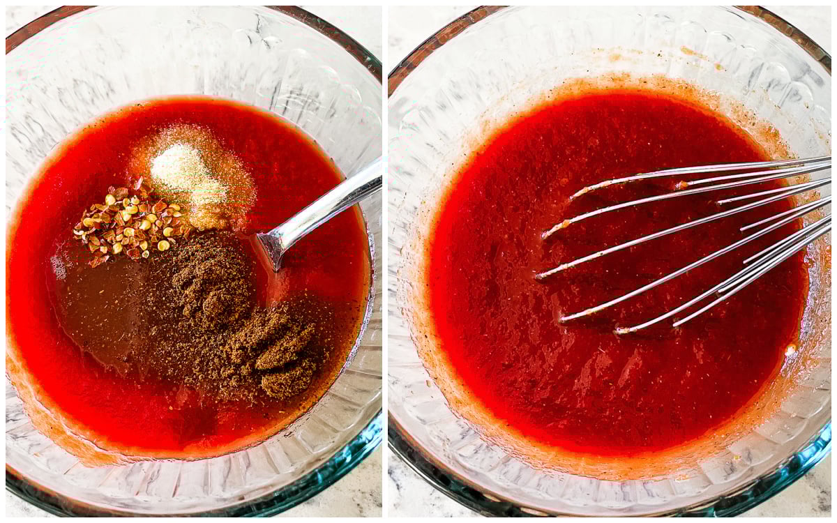 - Combine tomato sauce, brown sugar, vinegar, chili powder, garlic powder, onion powder, and red pepper flakes in a small bowl or mason jar. Whisk until well blended.