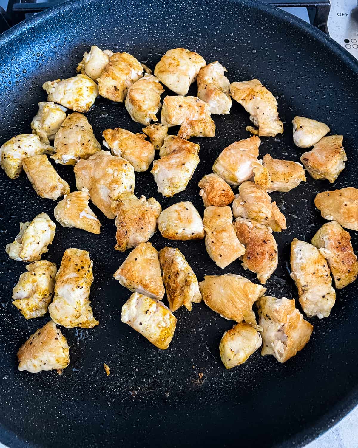 - BROWN CHICKEN – In a large skillet, heat the oil over medium high heat. Add the chicken to the hot oil with the salt, pepper, and some of the curry powder. Cook for about 5 minutes, or until all sides are golden brown. Remove from the pan.