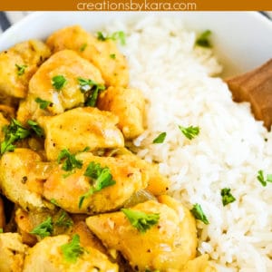 Tender chicken, creamy coconut milk, and a perfect blend of ground spices, all served over hot cooked rice. Simply unforgettable, especially if you add a side of homemade naan bread!