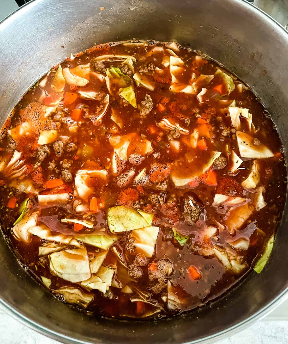 - Add the tomato sauce, beef broth, chopped cabbage, diced carrots, rice, brown sugar, Italian seasoning, Worcestershire, salt, and pepper to the pot.