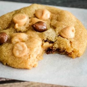 Yummy peanut butter chips star in this recipe, but I also added some chocolate chips. Because peanut butter and chocolate just go together in my book. Of course, if you want, you could just replace the chocolate chips with all peanut butter. I’ve actually tried it, and it still makes for a mighty tasty cookie!