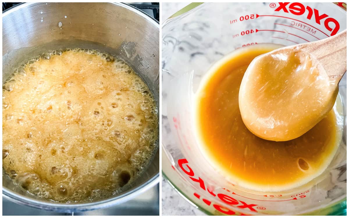 - MAKE THE CARAMEL – Bring the butter, sugars, corn syrup, heavy cream, and salt to a roiling boil in a heavy saucepan over medium heat. Turn to medium-low heat and boil for 5-8 minutes, or until thickened. Remove from the heat and stir in the vanilla. Let cool. (You don’t want to add hot caramel to your ice cream.)