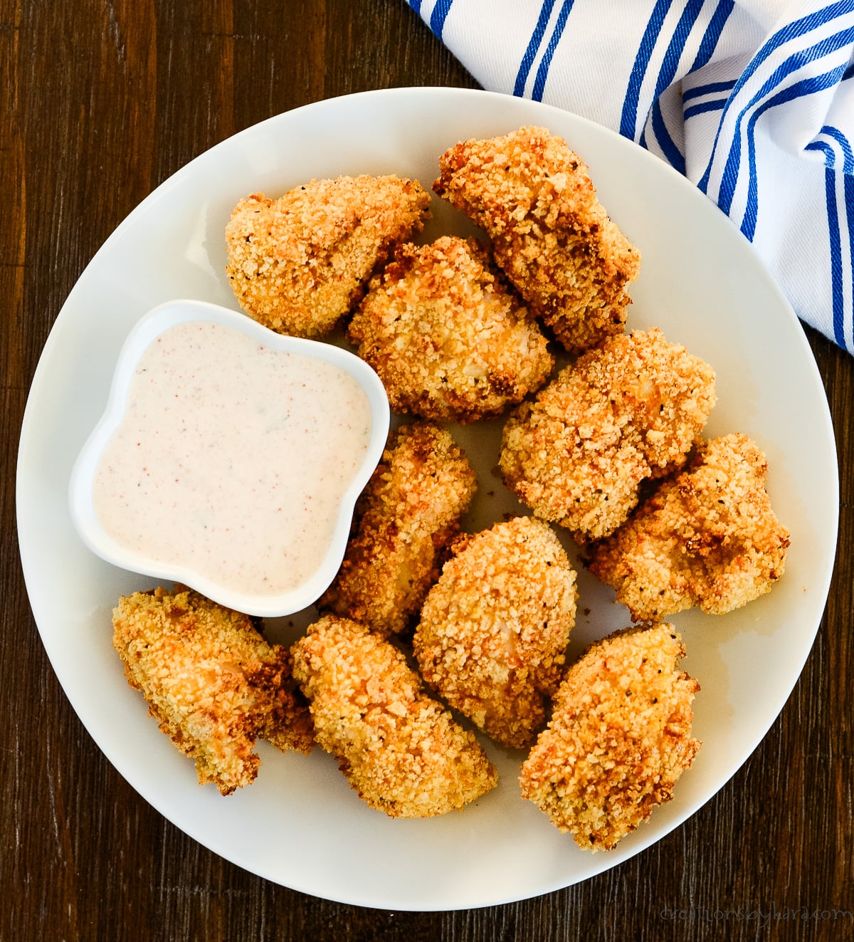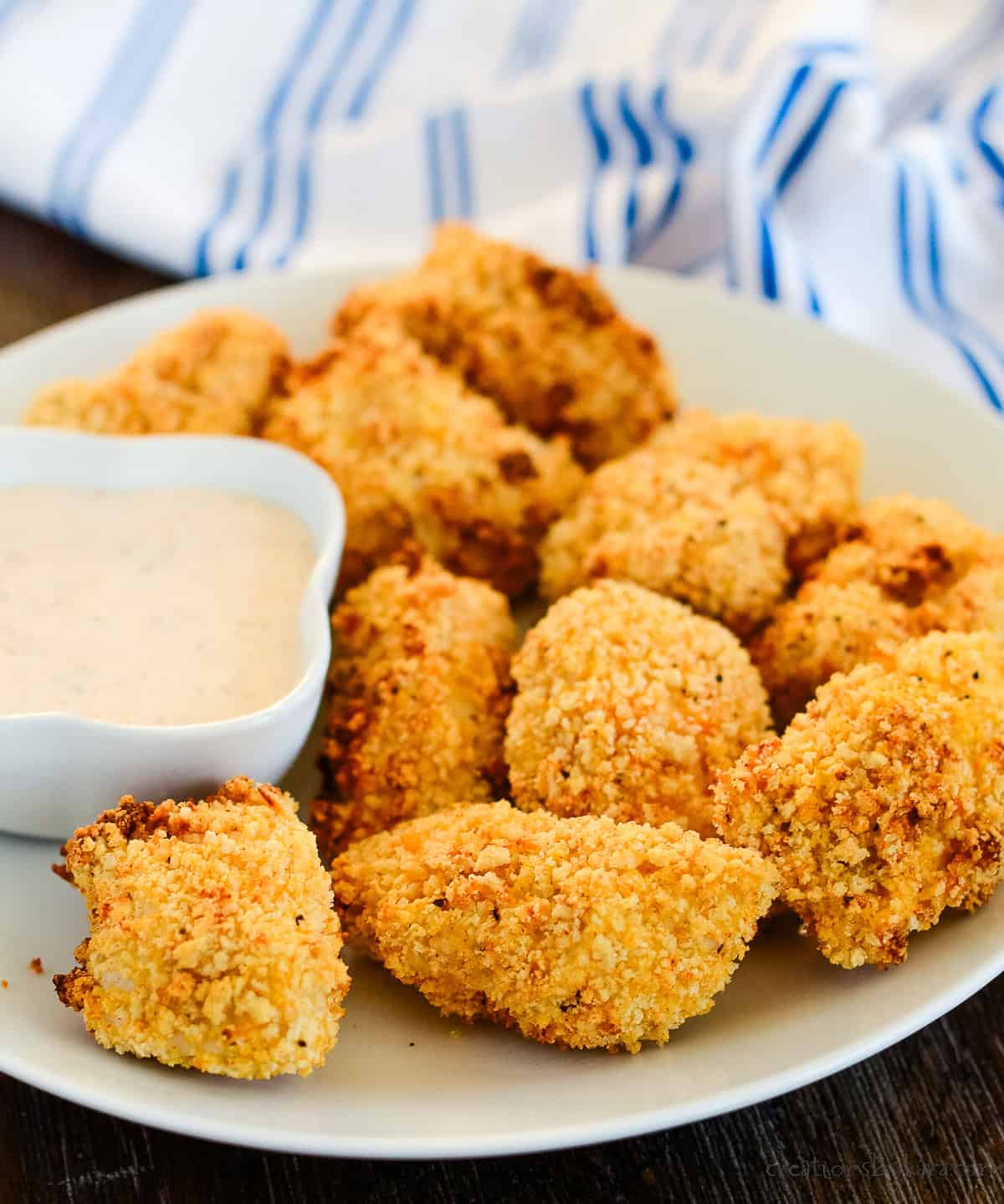 - SERVE – We like to eat our nuggets with dipping sauce! While you are cooking the second batch, you can keep the nuggets warm by placing them on a cookie sheet in an oven heated to 200 degrees.