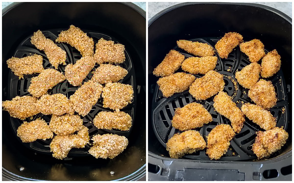 - Don’t overcrowd the air fryer – Make sure the chicken is in a single layer, with enough space in between that the air can flow. You will need to make multiple batches, so don’t try to jam them in and cook them all at once.