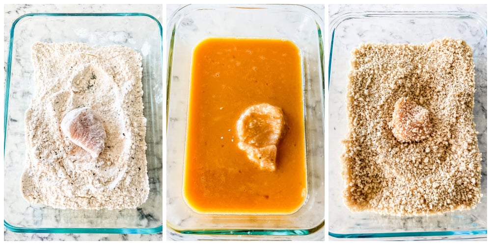 - Dip the chicken pieces in the flour mixture, then the egg mixture, then the panko mixture. Place on a cookie sheet or plate until they are all coated.