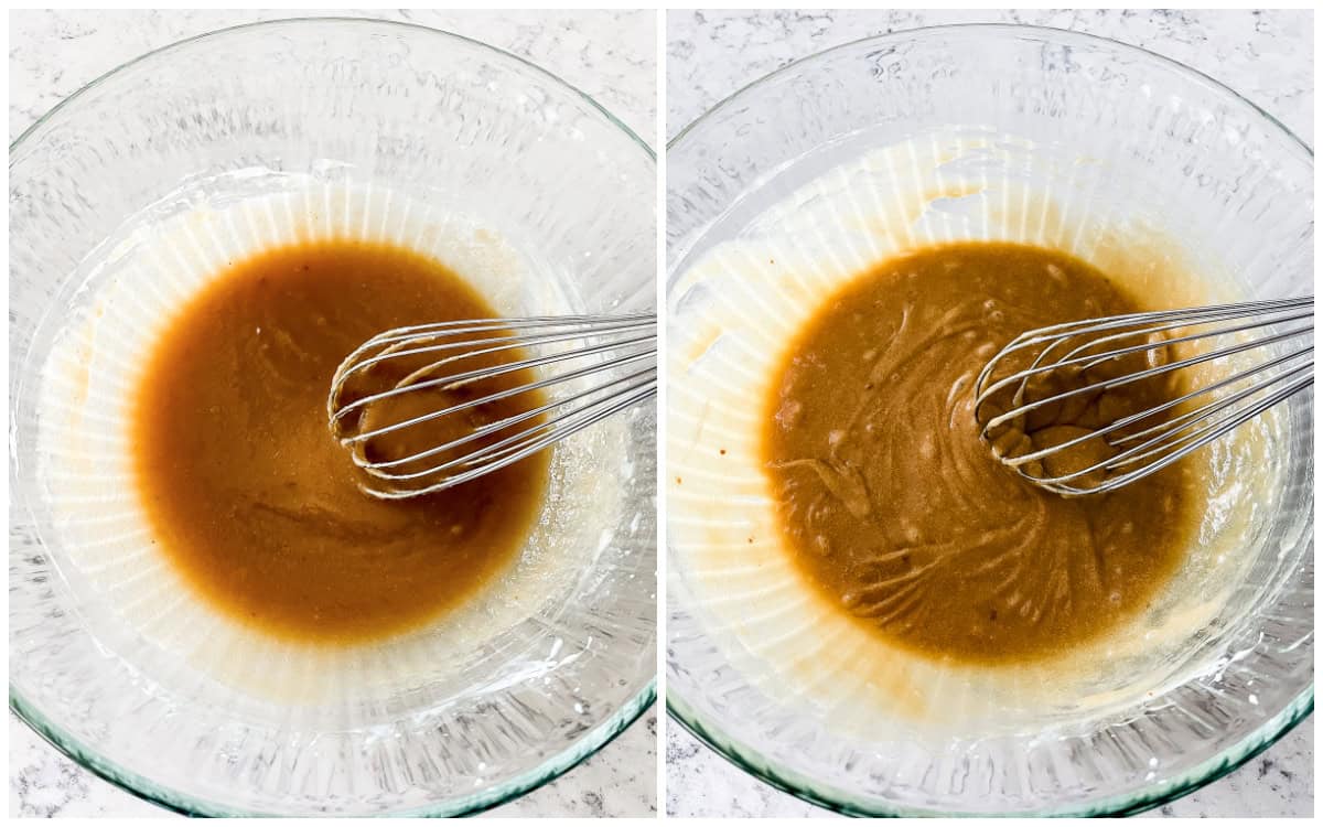 - WET INGREDIENTS – Whisk together the melted butter and sugars in a large bowl for about 2 minutes, then whisk in the eggs and vanilla.