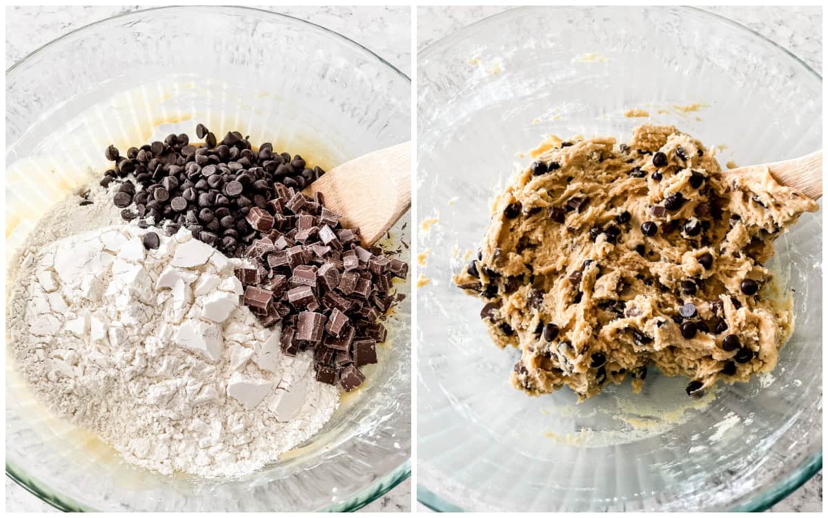 - DRY INGREDIENTS – In a separate bowl, whisk together the flour, baking soda, and salt. Add the flour mixture to the large bowl with the chocolate chips and chunks. Stir just until combined. (I like using an angled bamboo spatula for mixing cookie dough!)