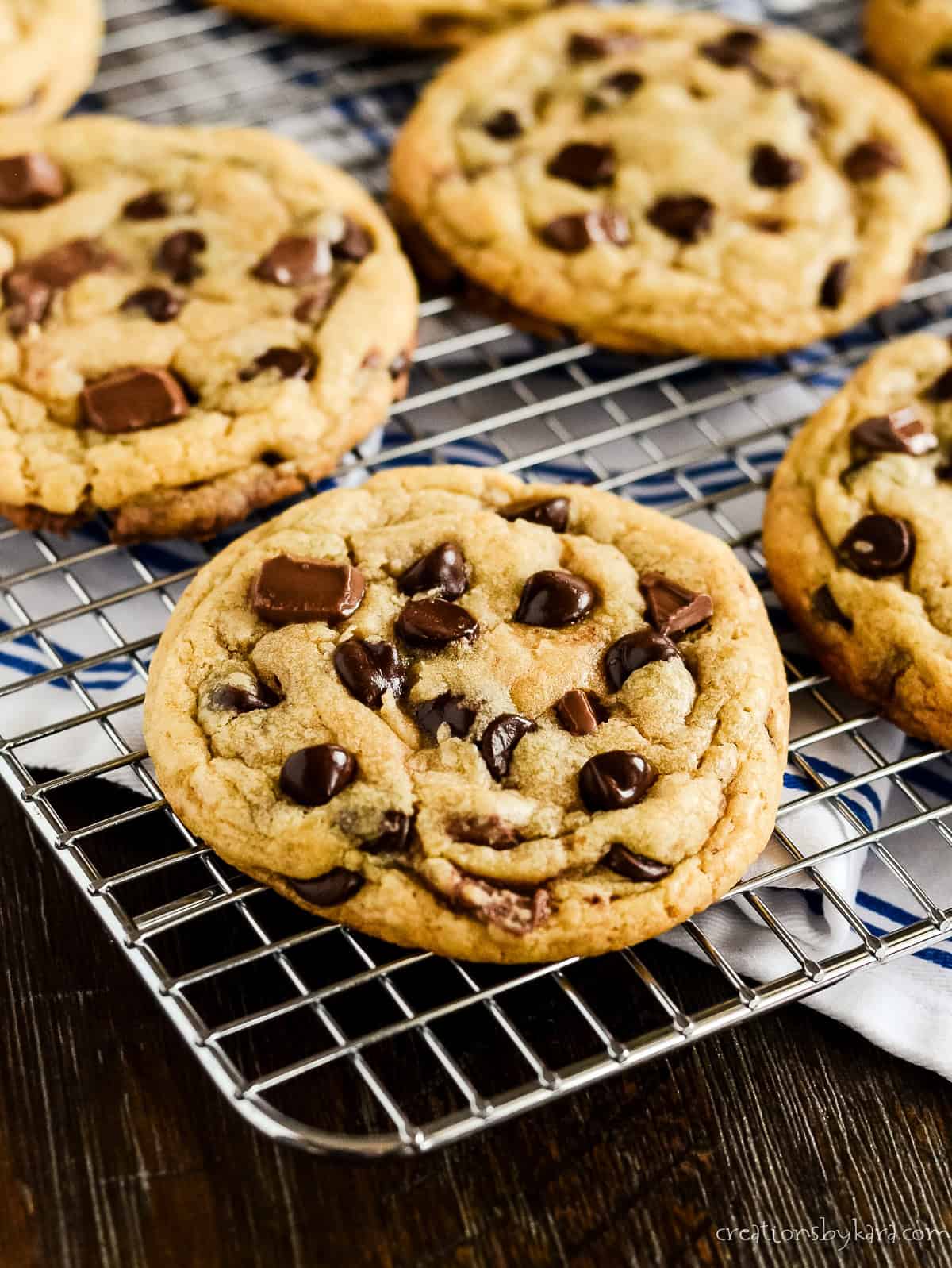 - GARNISH – For pretty, bakery style cookies, press a few chocolate chips and chunks on top of the baked cookies. Transfer them to cooling racks to cool completely before storing.